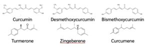 มีสาร Curcuminoids ในเหง้าของขมิ้นชัน เป็นกลุ่มสารที่ให้สีเหลืองส้ม มีประมาณ 1.8-5.4% ประกอบด้วย สาร Curucmin และสารอนุพันธุ์ ได้แก่ Desmethoxycurcumin และ Bismethoxycurcumin และยังมีสาระสำคัญจำพวก น้ำมันหอมระเหย (Volatile oil) ให้สีเหลืองอ่อน มีอยู่ 2-6% ประกอบด้วยสาร Monoterpenes และ Sesquiterpenes ได้แก่ Turmerone, Zingeberene, Curcumene, Borneol เป็นต้น