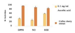 สารสกัดผลเชอรี่กาแฟมีคุณสมบัติเป็นสารต้านอนุมูลอิสระ (Anti-oxidant) สามารถป้องกันการเกิดปฏิกิริยาออกซิเดชันและทำให้เซลล์ผิวเสื่อมสภาพซึ่งเป็นสาเหตุของการเกิดรอยเหี่ยวย่นของผิวหนัง จากความชรา (Aging) และจากแสงแดด (Photo aging)