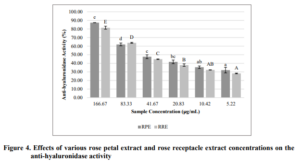 สารสกัดจากดอกกุหลาบมีคุณสมบัติในการช่วยยับยั้งการทำงานของเอนไซม์ hyaluronidase ส่งผลให้ HA ในผิวไม่ถูกทำลาย จึงช่วยให้ผิวยังคงความชุ่มชื้น ความเต่งตึง ลดการเกิดริ้วรอยและทำให้ผิวคงความยืดหยุ่นและความเรียบเนียนได้